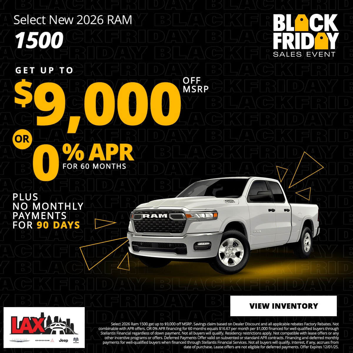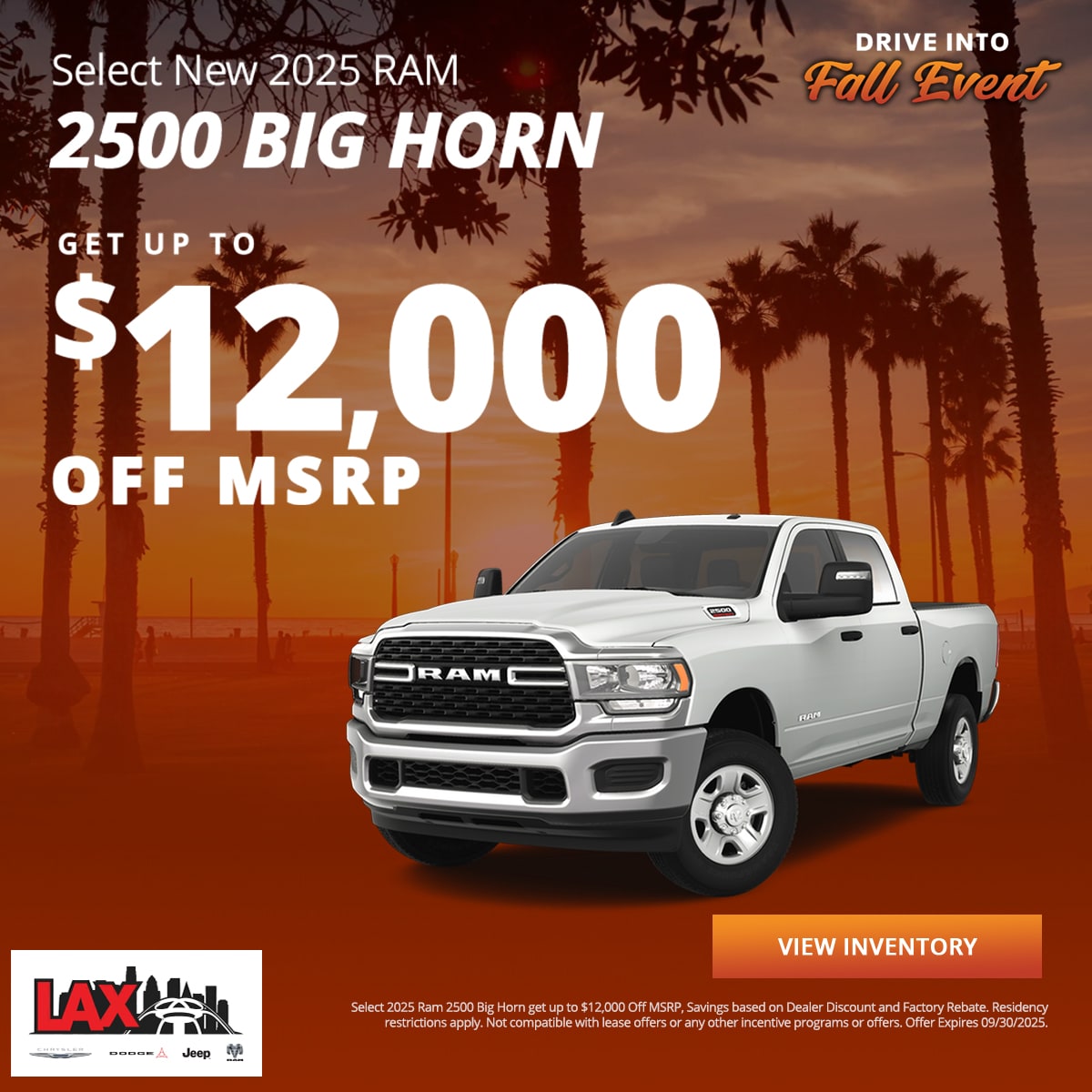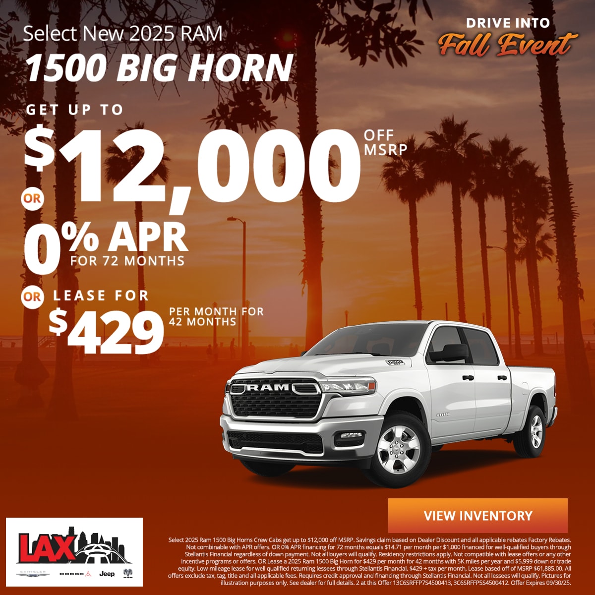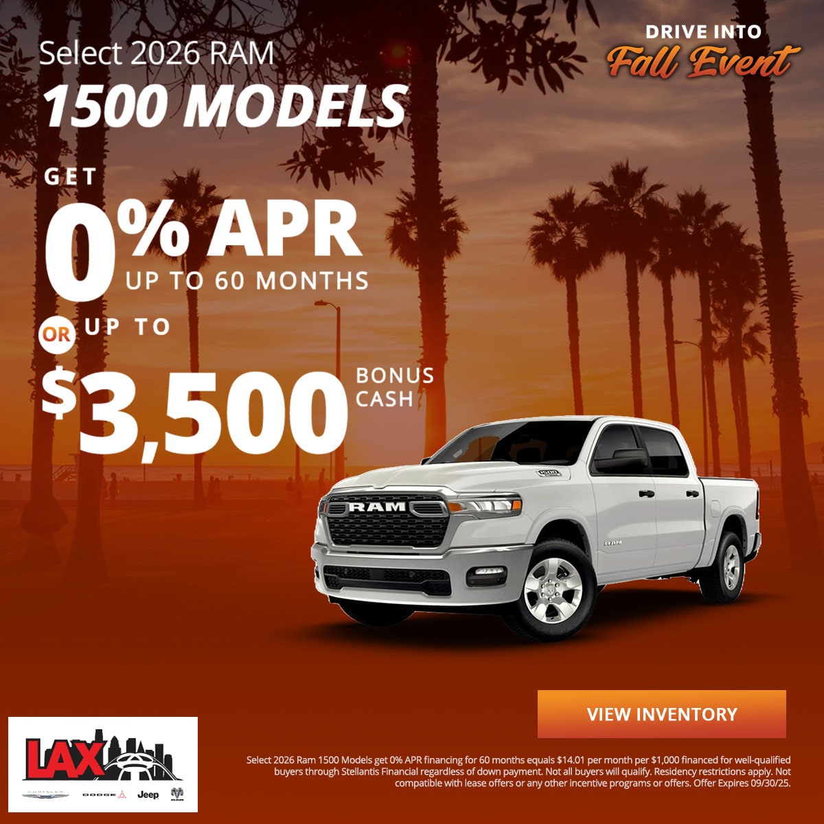 At LAX Chrysler Dodge Jeep Ram (CDJR), we are committed to providing our customers with exceptional value through our exclusive new vehicle specials. Our current offers are designed to make owning a new Chrysler, Dodge, Jeep, or Ram more accessible and affordable. Explore our latest deals below and find the perfect vehicle that suits your lifestyle and budget.